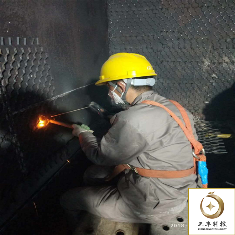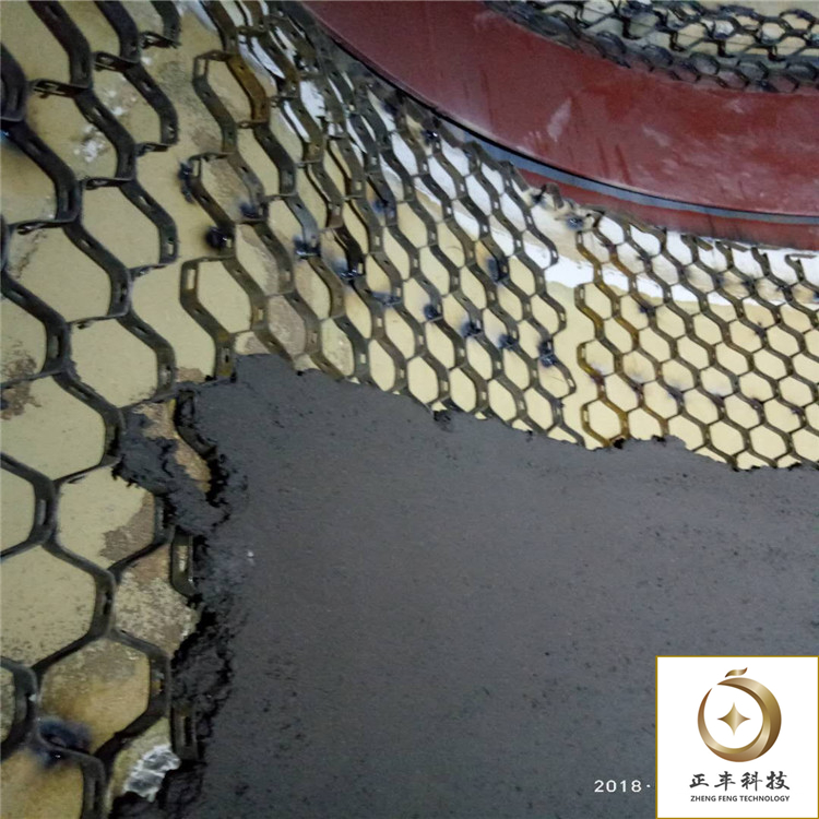 (1) 龟甲网焊接:在设备表面上焊接龟甲网,龟甲网采用电弧焊焊接,每个接触骨架空格内双面焊接,焊点间距约20毫米。其焊点抗拉强度平均值:380Mpa抗压强度平均值:560Mpa。